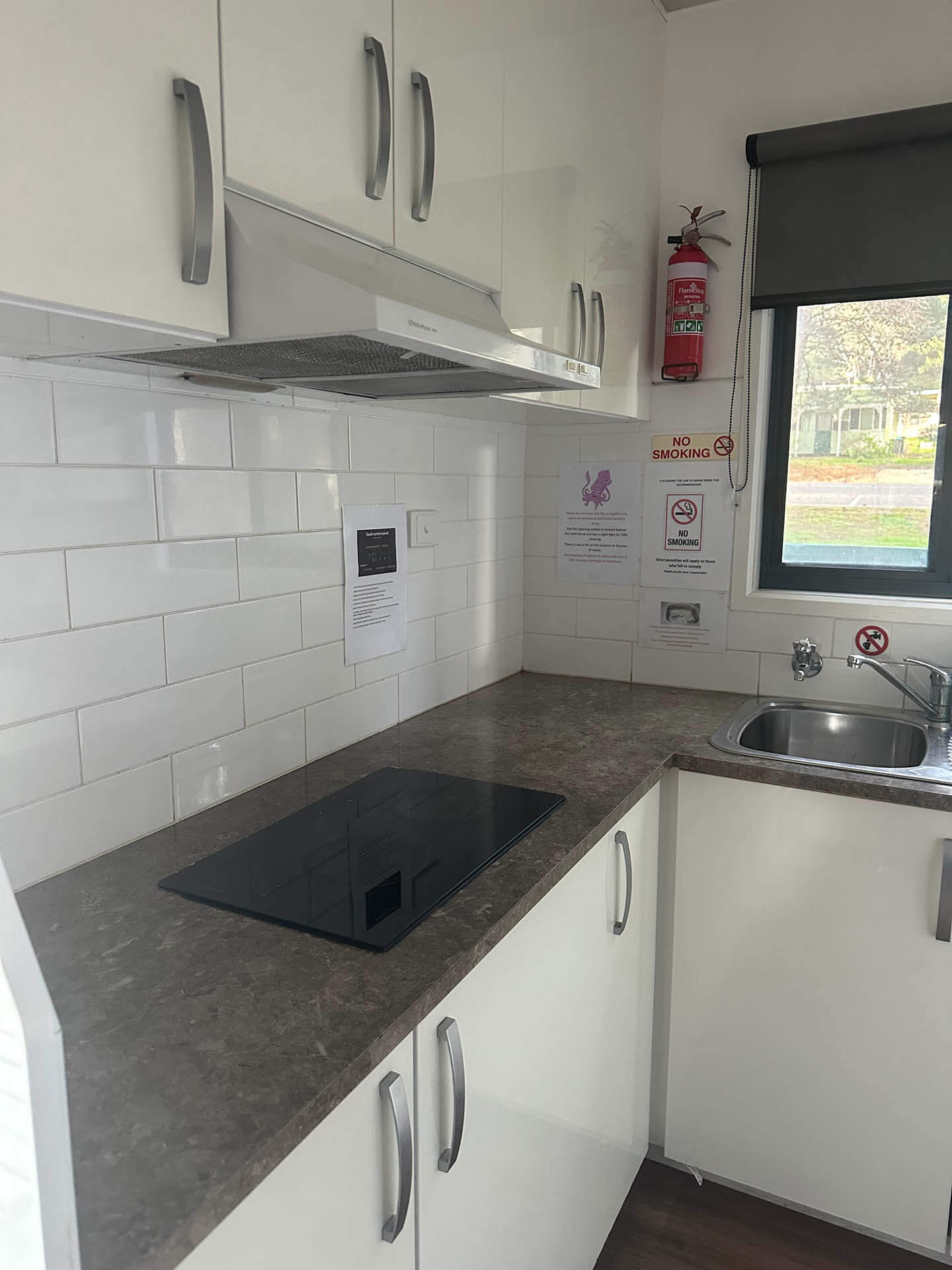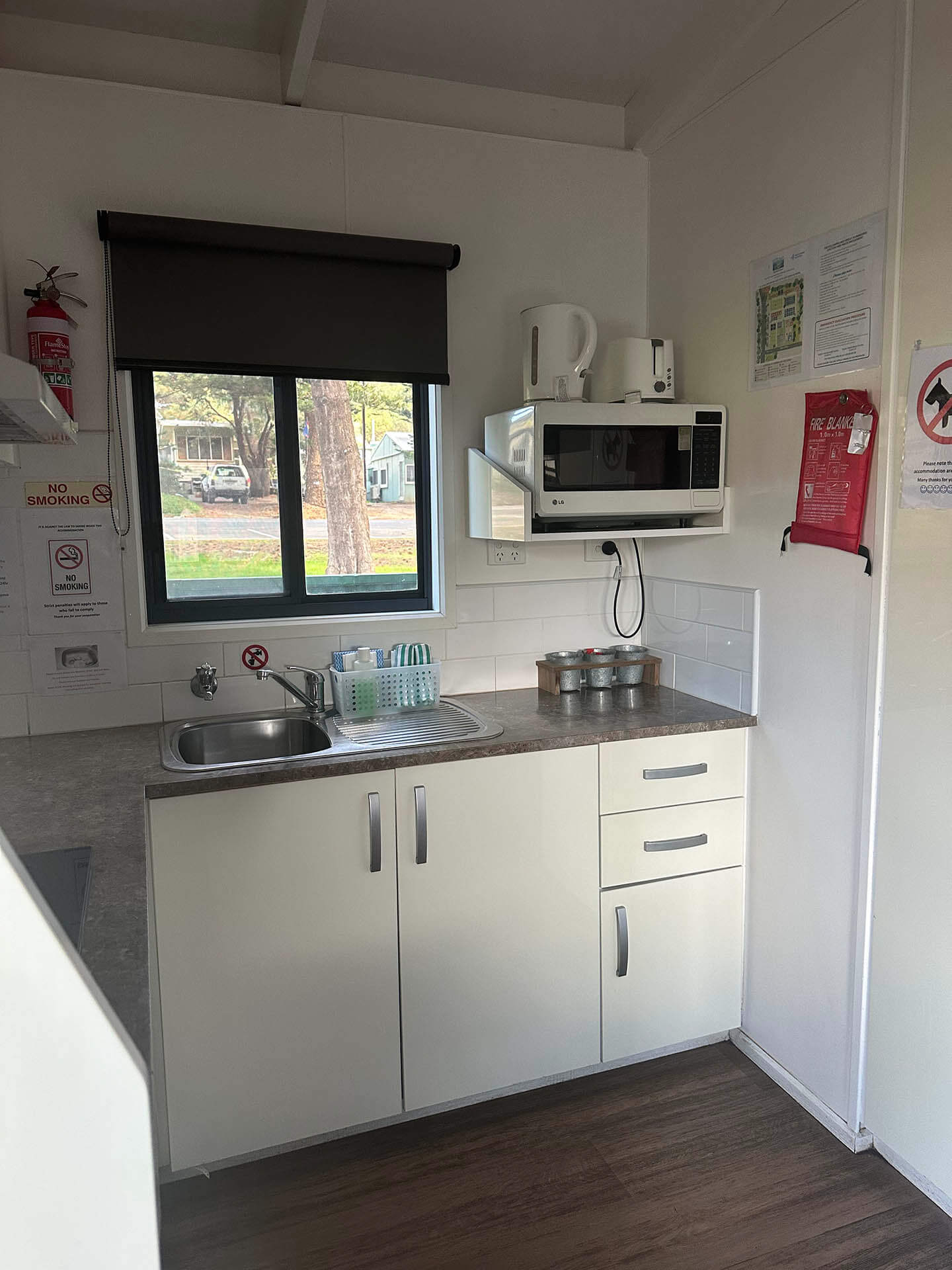 Complete with microwave, toaster, kettle, crockery and cutlery.